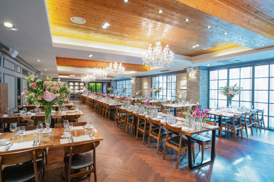 연회장은 첫 발을 들이는 순간부터 따뜻한 우드톤의 감성이 느껴지는 공간입니다. 바닥은 정갈한 헤링본 원목 바닥으로 마감되어 있고, 천장은 천연 원목의 나뭇결을 살려 고급스러움과 포근함을 동시에 전달합니다. 마치 유럽의 레스토랑을 떠오르게 하는 이곳은, ‘예식의 여운을 잇는 하객들에게 품격 있는 식사 시간’을 제공하는 분위기입니다.